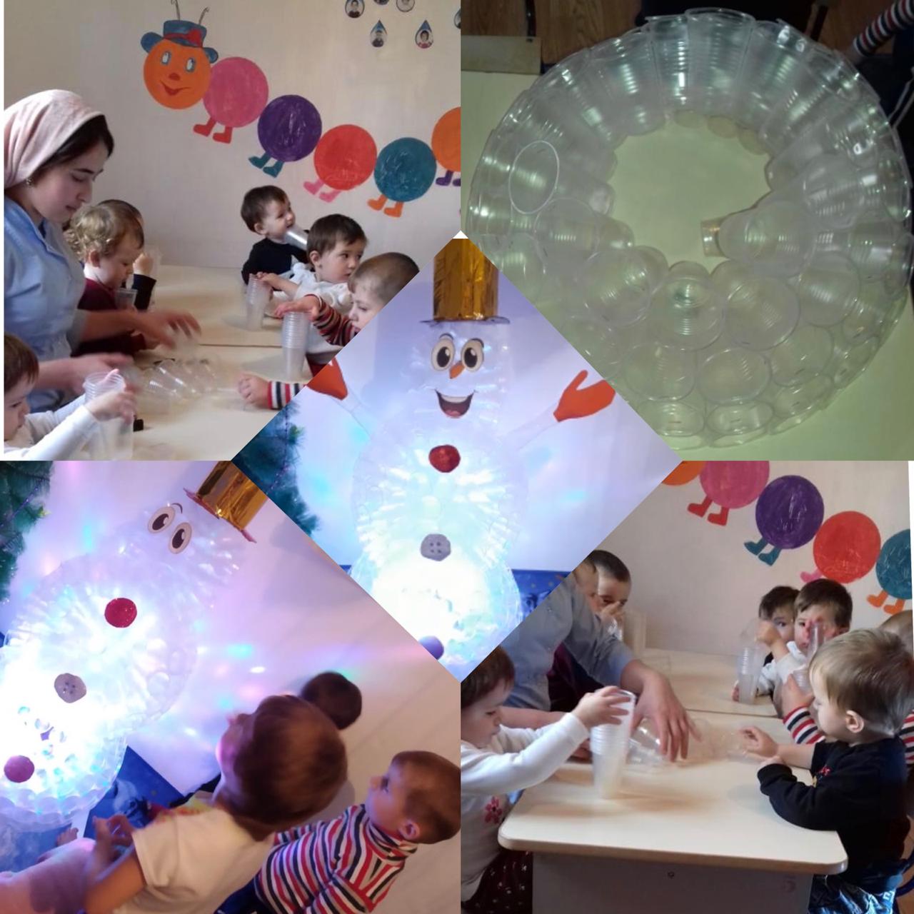 В разновозрастной группе «Ангелочки» развесили гирлянды, зажгли разноцветные огоньки, нарядили ёлку и изготовили снеговика из пластиковых стаканчиков. Дети с большим энтузиазмом раскладывали стаканчики и наблюдали за процессом. Таким образом, в группе появился очень красивый и веселый снеговик.