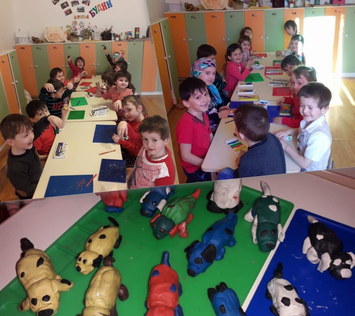 Цель: научить детей лепить собак и щенят, передавая их характерные особенности (тело овальное, голова круглая, морда вытянутая, короткие лапы и хвост)