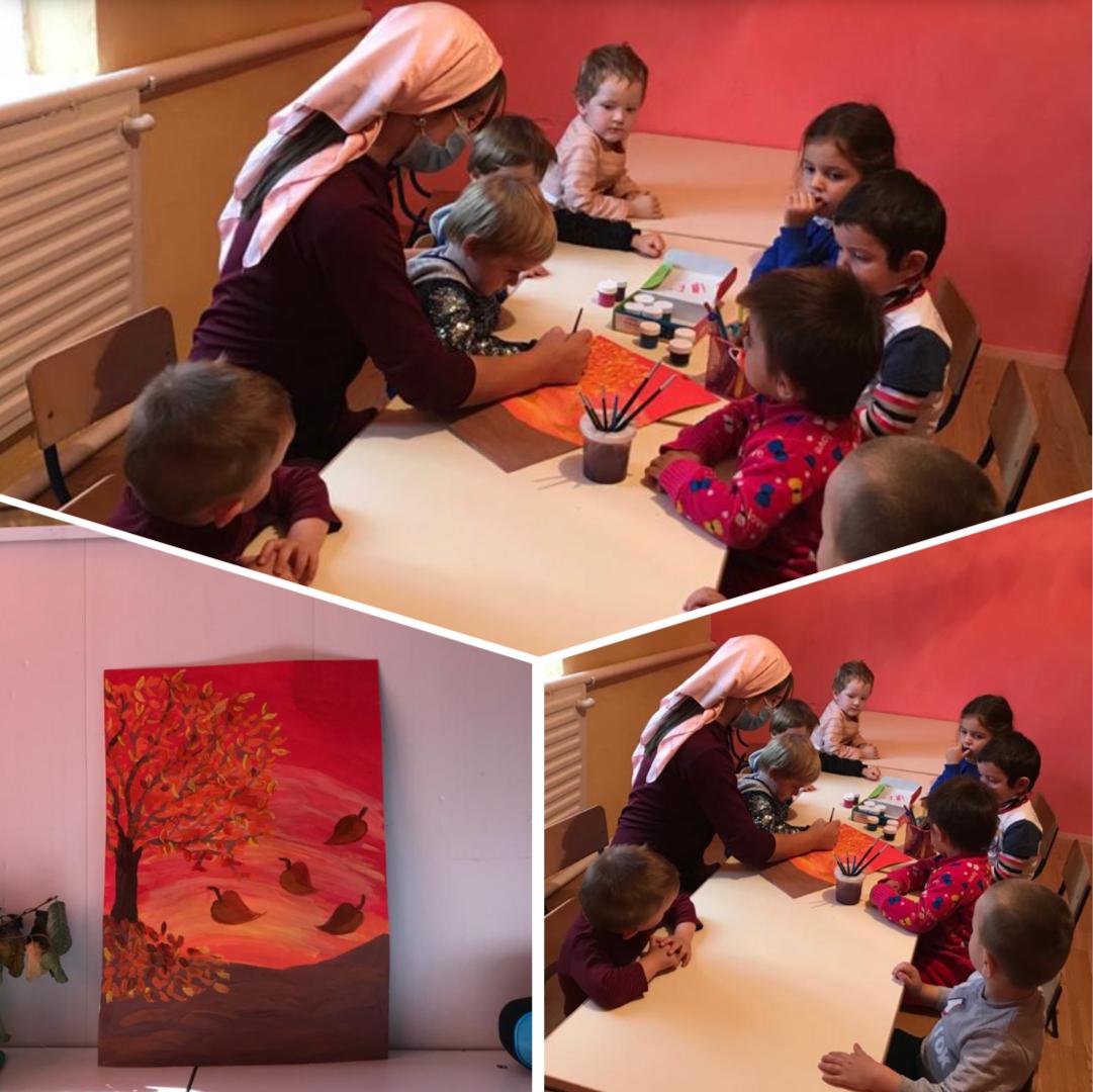 С целью расширить представления дошколят о природном явлении листопаде и закрепить названия цветов (желтый, красный, оранжевый), в разновозрастной группе «Ангелочки» проведено занятие по рисованию «Осенний листопад»